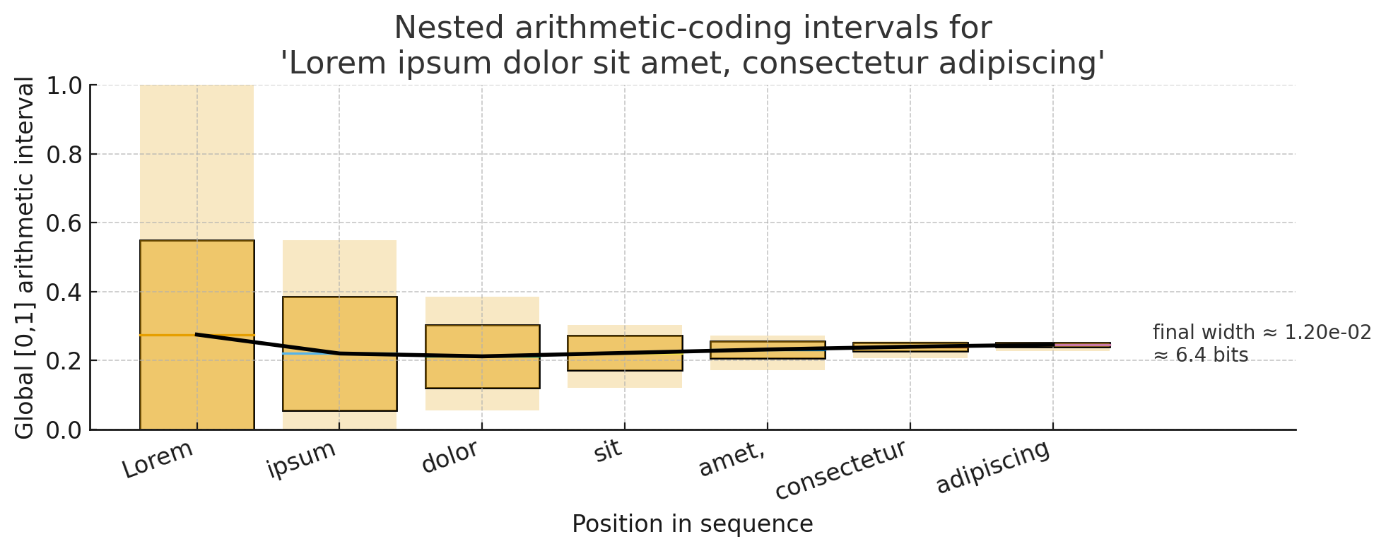 so on and so forth until you reach the end of the string you want to compress and you end up with some “final interval width” \(P(m)\) on the real interval \([0,1]\) which represents your string.