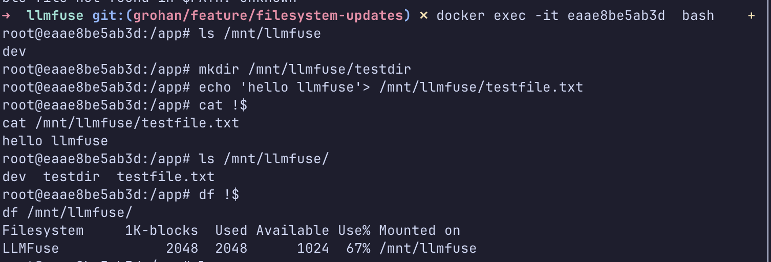 At this point, I wrote … possibly the smallest filesystem I’ve seen… to give my model a spin in the real world. Every FUSE operation was a passthrough to the LLM, for example: